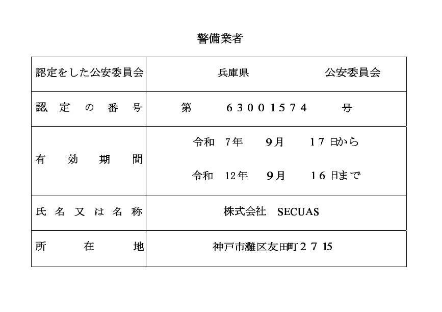 | 警備種目 | 2号警備(交通誘導警備および雑踏警備) |